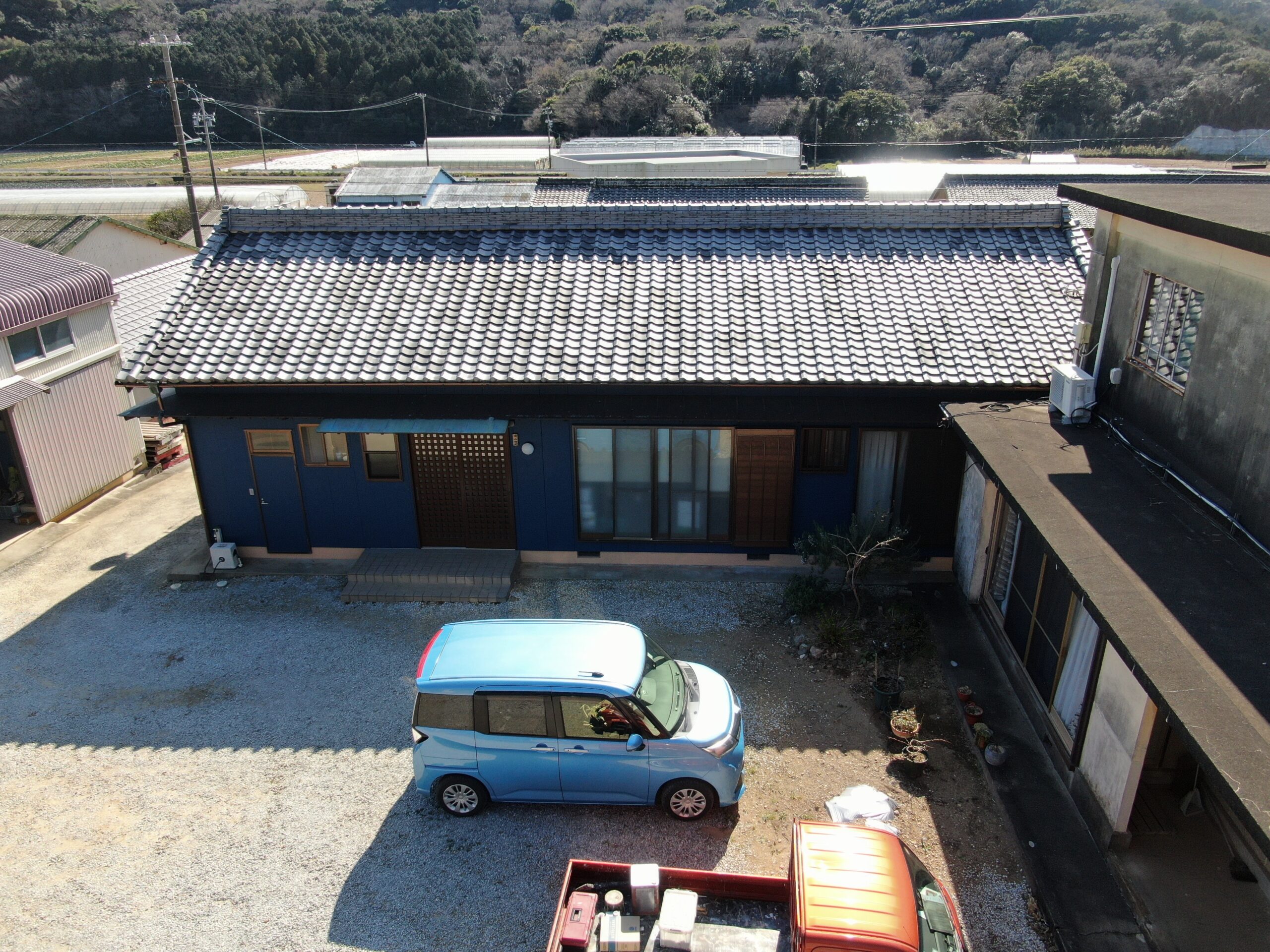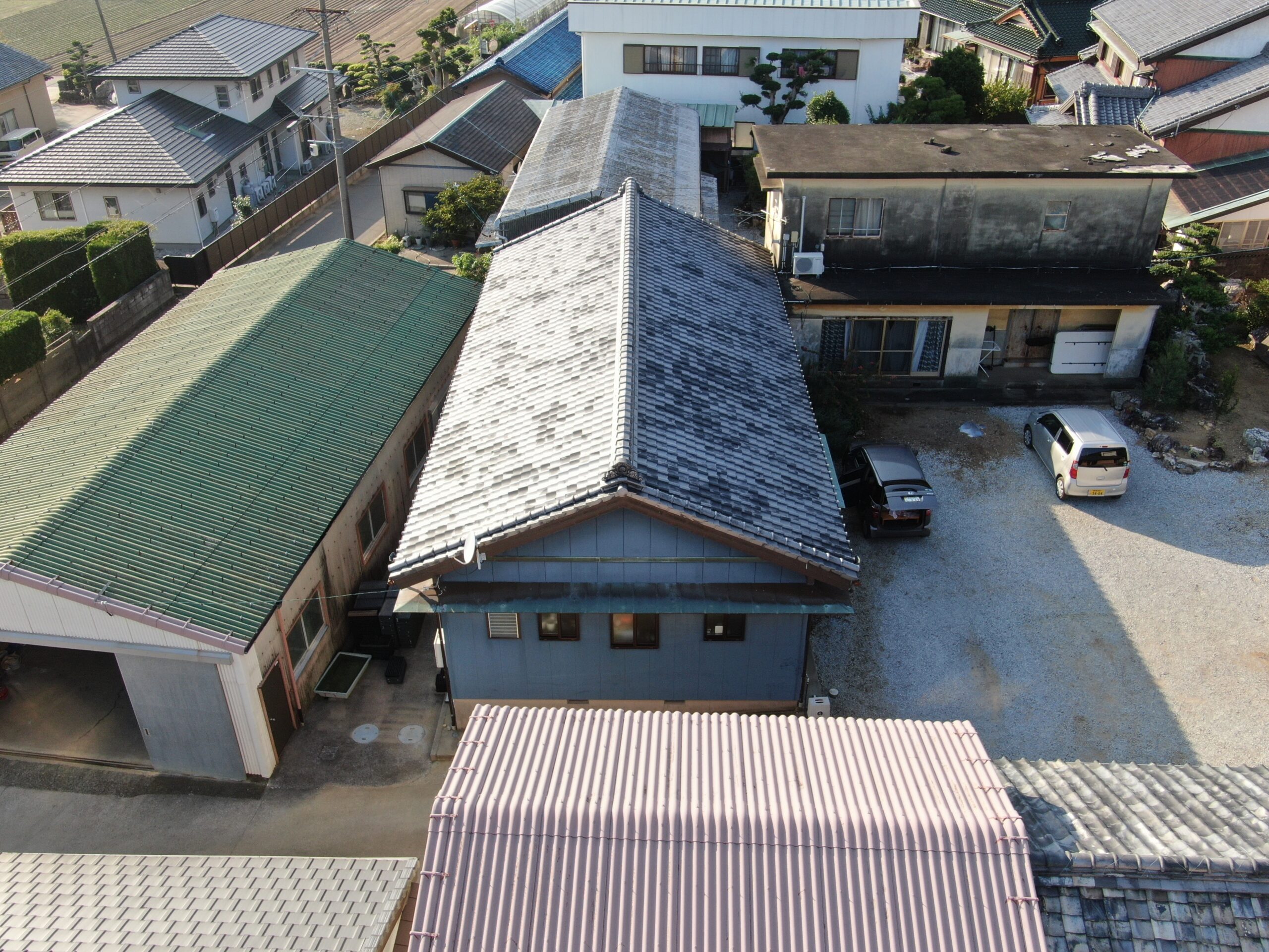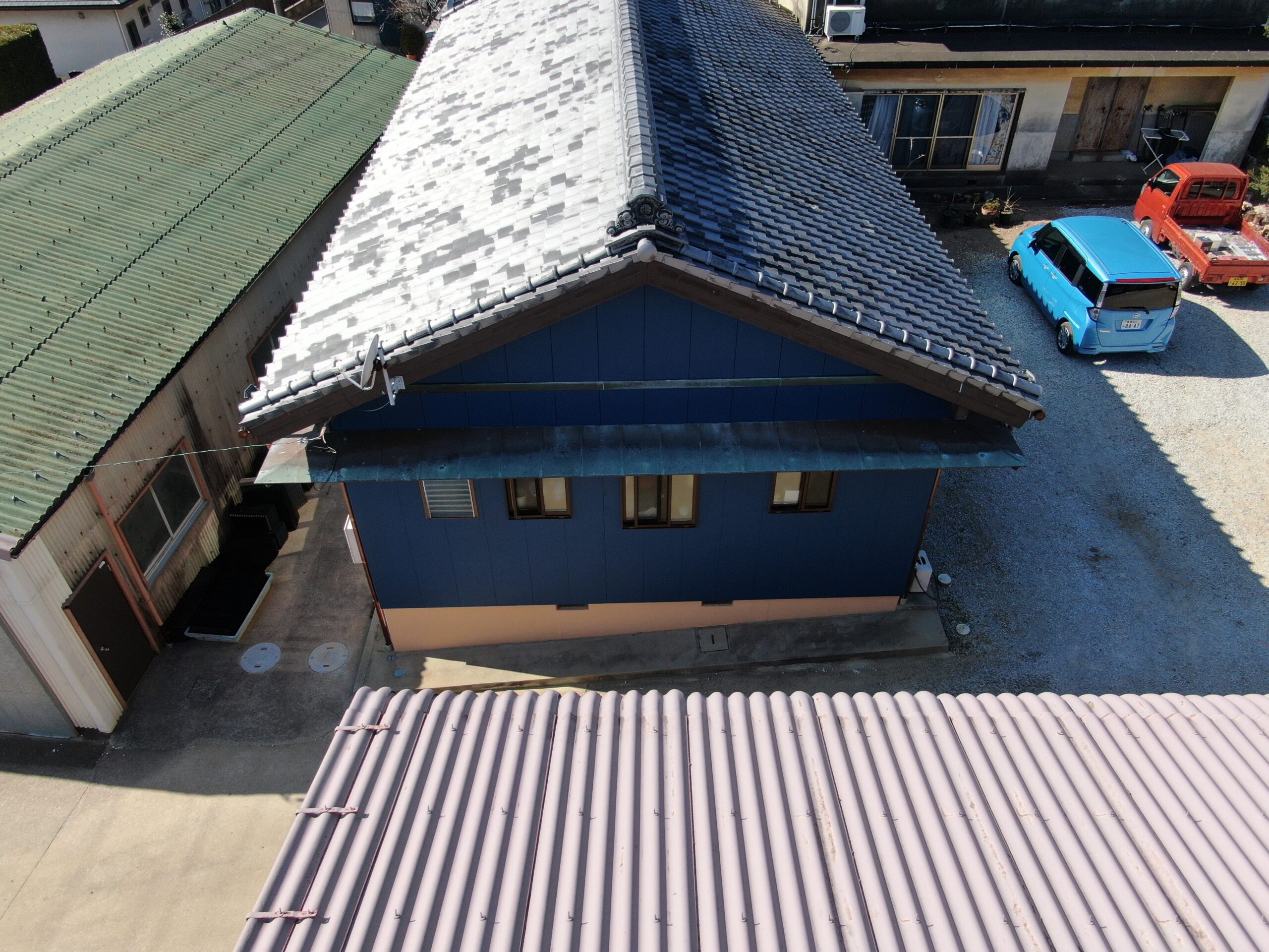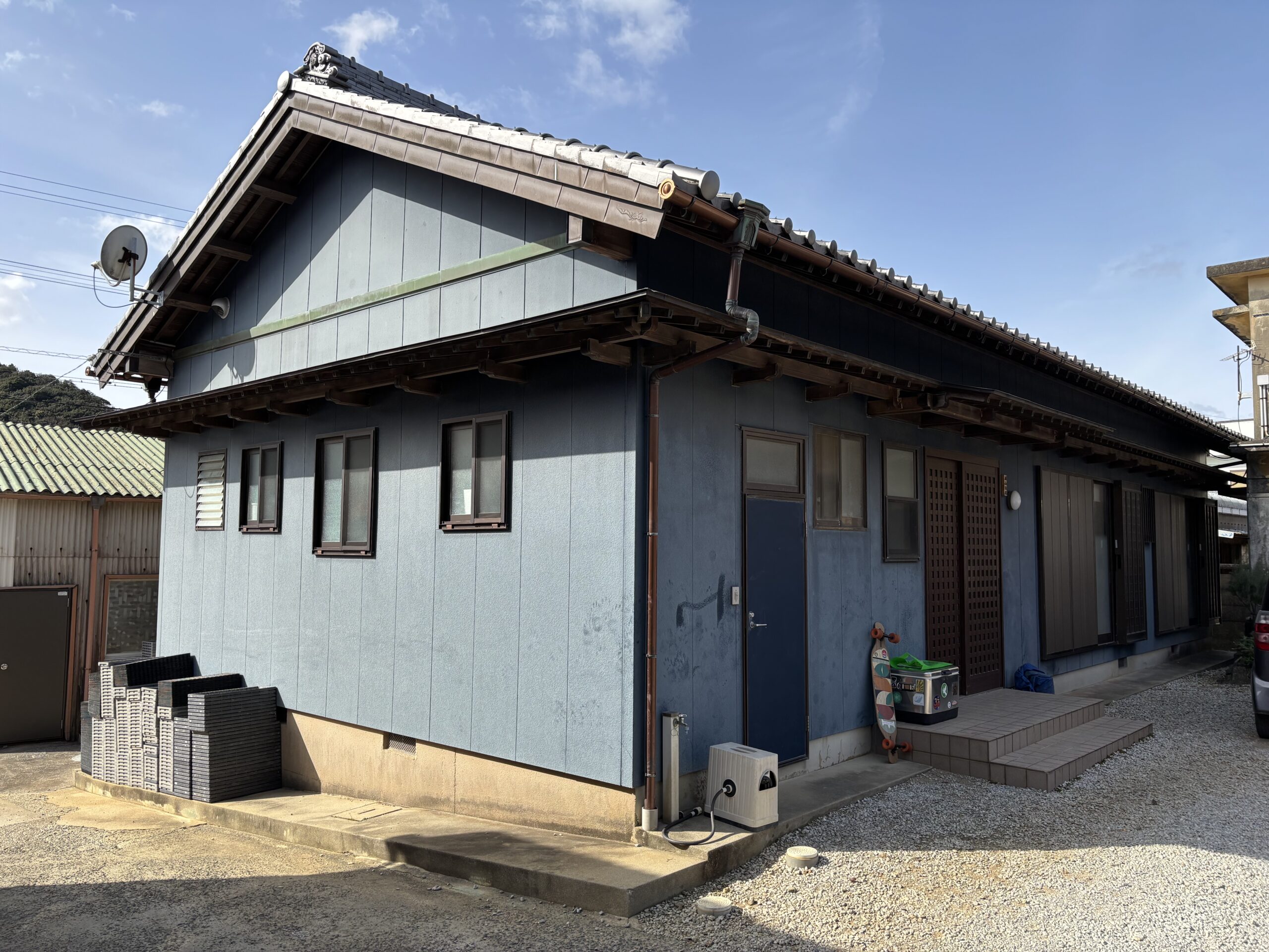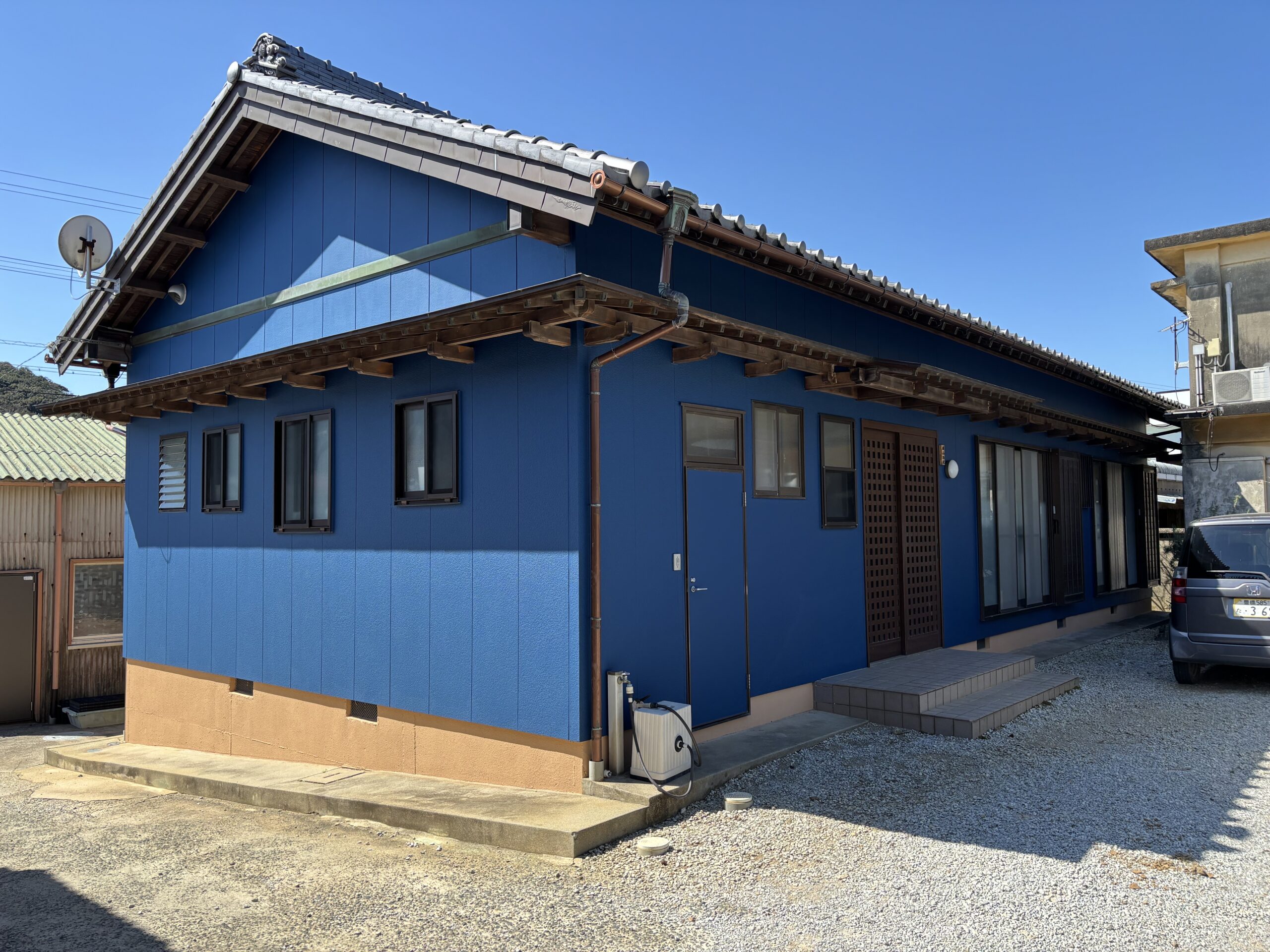 コーキングには「ヘンセイシリコンNB-LM」を使用し、メタリックブルーのアクセントが外観に個性と統一感をプラス。防水性と耐久性の向上にも寄与しています。